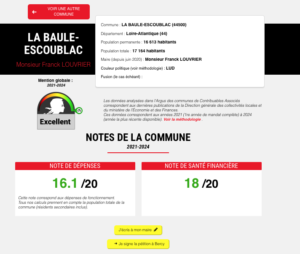 Au niveau de la presqu’île, l’infographie de synthèse diffusée autour de l’Argus illustre l’écart entre communes voisines : La Baule (16,1/20 en dépenses ; 18/20 en santé financière) devant Le Croisic (7,7/20 ; 15,8/20), Le Pouliguen (10,3/20 ; 14,9/20), Batz-sur-Mer (8,4/20 ; 14,4/20), Pornichet (14,2/20 ; 12,1/20) et Guérande (11,2/20 ; 8/20).
