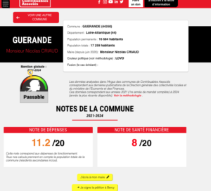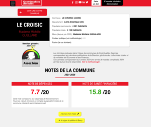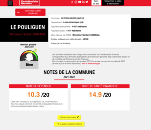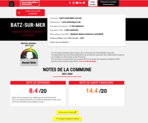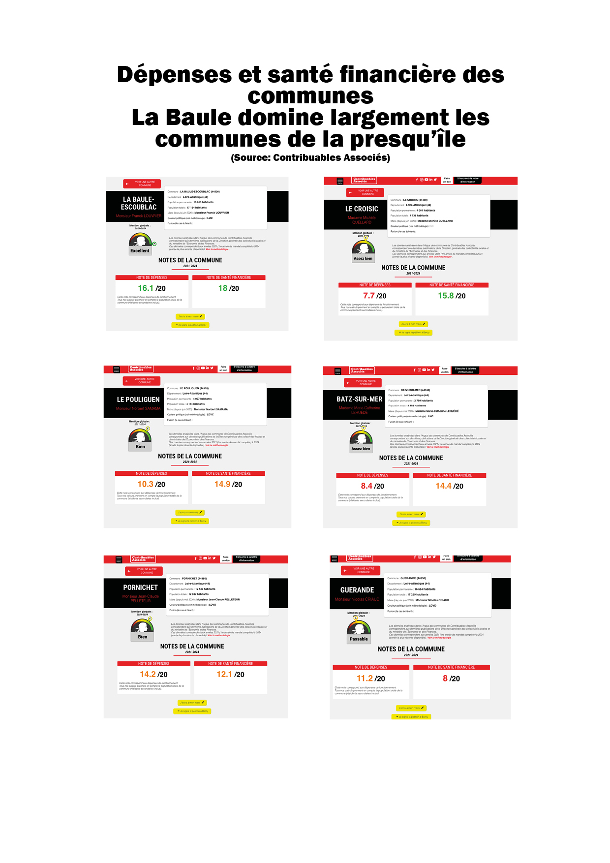 Au niveau de la presqu’île, l’infographie de synthèse diffusée autour de l’Argus illustre l’écart entre communes voisines : La Baule (16,1/20 en dépenses ; 18/20 en santé financière) devant Le Croisic (7,7/20 ; 15,8/20), Le Pouliguen (10,3/20 ; 14,9/20), Batz-sur-Mer (8,4/20 ; 14,4/20), Pornichet (14,2/20 ; 12,1/20) et Guérande (11,2/20 ; 8/20).